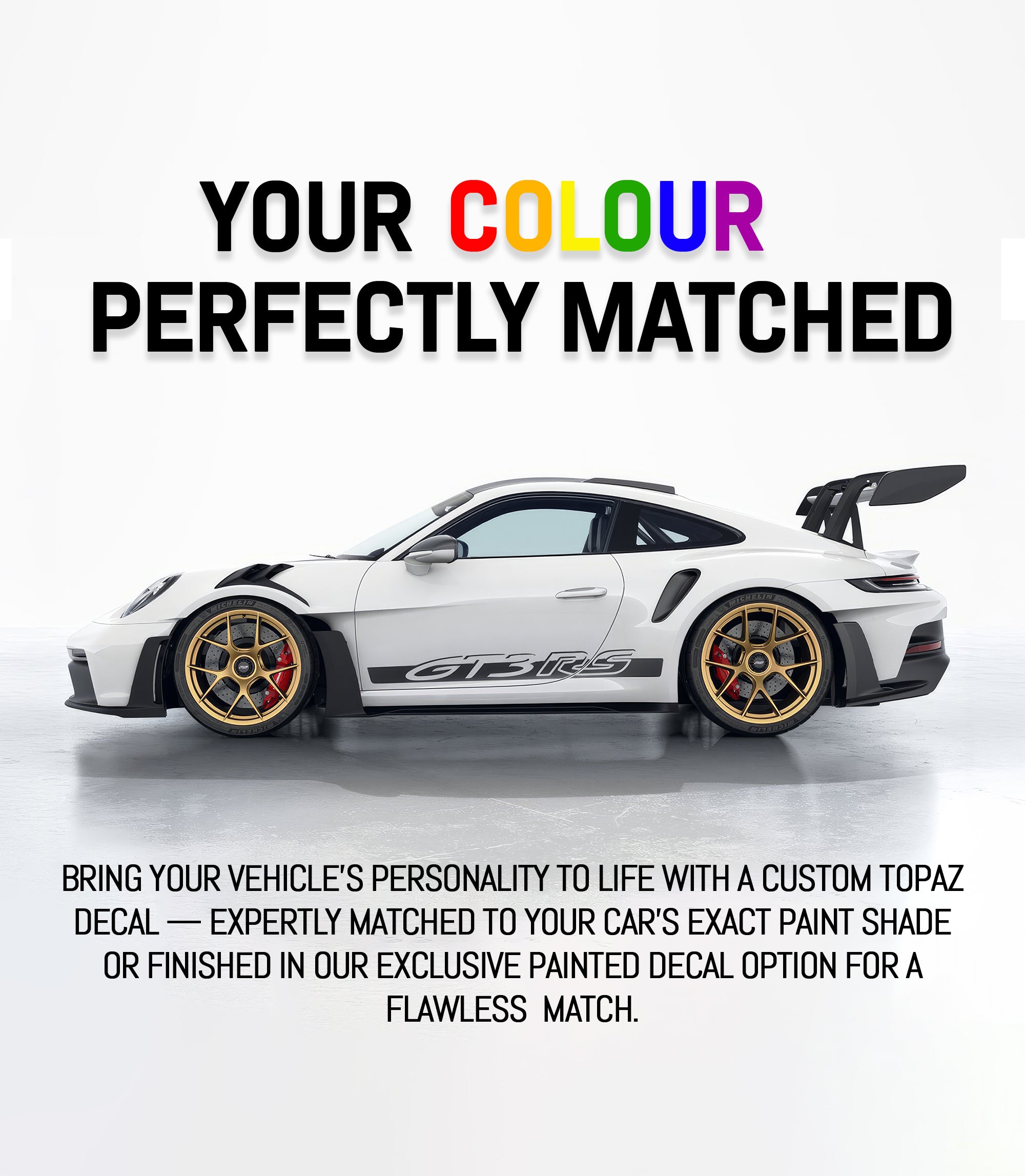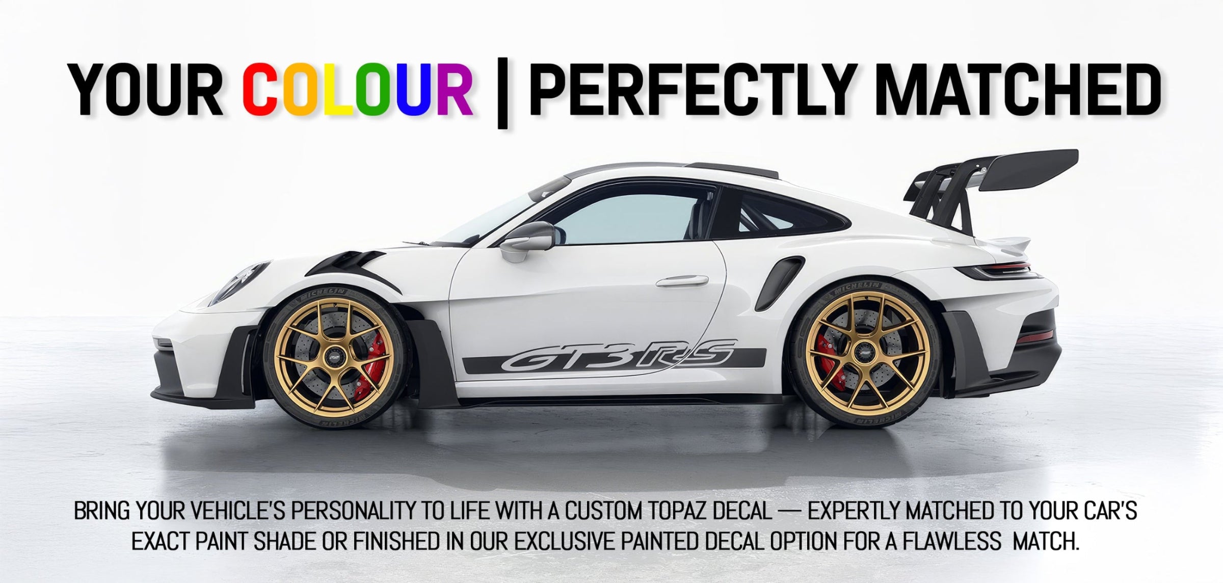 At Topaz we specialise in decals and race car Liveries. Each decal/livery is designed and produced in-house meaning we can match decals, accents and sponsor logos to colours of your choice. Whether it's OEM or Aftermarket styles, we've got you covered!